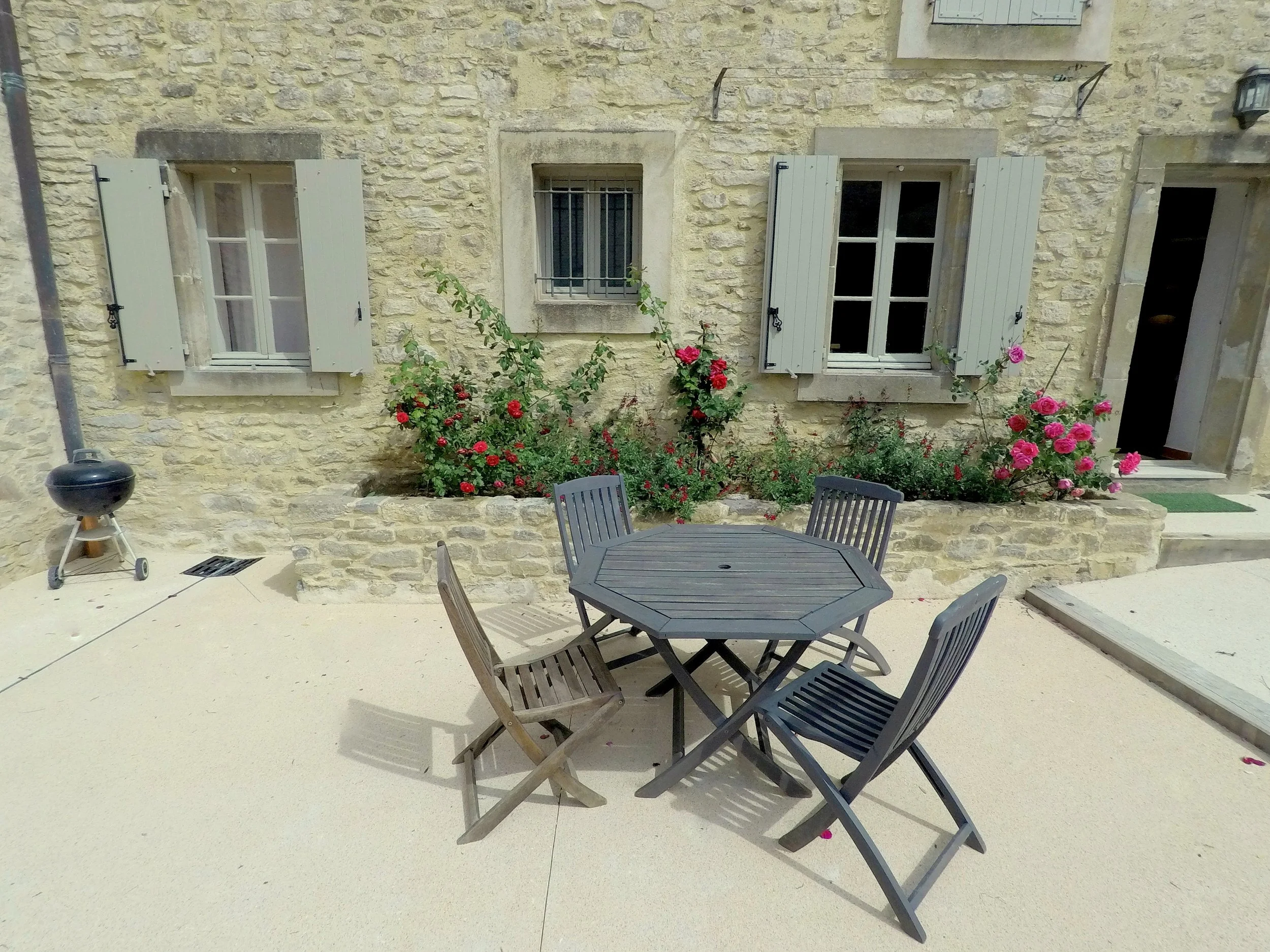 ....Les Orangers offers a living room with fitted kitchen area (oven, micro wave, dish washer, toaster, coffee machine…). Two bedrooms, bathroom and separate WC. The gîte opens onto a quiet inner courtyard with a table and BBQ.